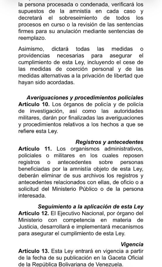 El documento indica en su artículo 8 que «cesará cualquier medida de coerción personal y las medidas alternativas a la privación de libertad que hayan sido acordadas» en casos contra presos políticos.