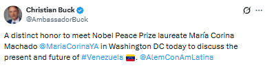 La líder venezolana y Premio Nobel de la Paz, María Corina Machado, sostuvo este viernes un encuentro en la capital estadounidense con representantes de la política internacional, entre ellos el diputado alemán Knut Abraham.