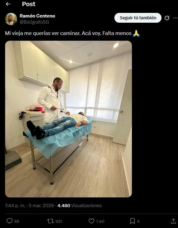 La imagen publicada por el comunicador lo muestra en una camilla de evaluación médica, acompañada de una frase que resume su lucha personal y el cumplimiento de una promesa familiar: “Mi vieja me quería ver caminar. Acá voy. Falta menos”.