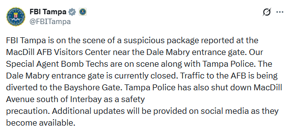 De acuerdo con el Buró de investigación Federal (por sus siglas en inglés (FBI) en Tampa, el incidente ocurrió cerca de la entrada de Dale Mabry de la base aérea. Agentes especializados en explosivos del FBI se encuentran en el lugar junto a oficiales del Departamento de la policía de Tampa.