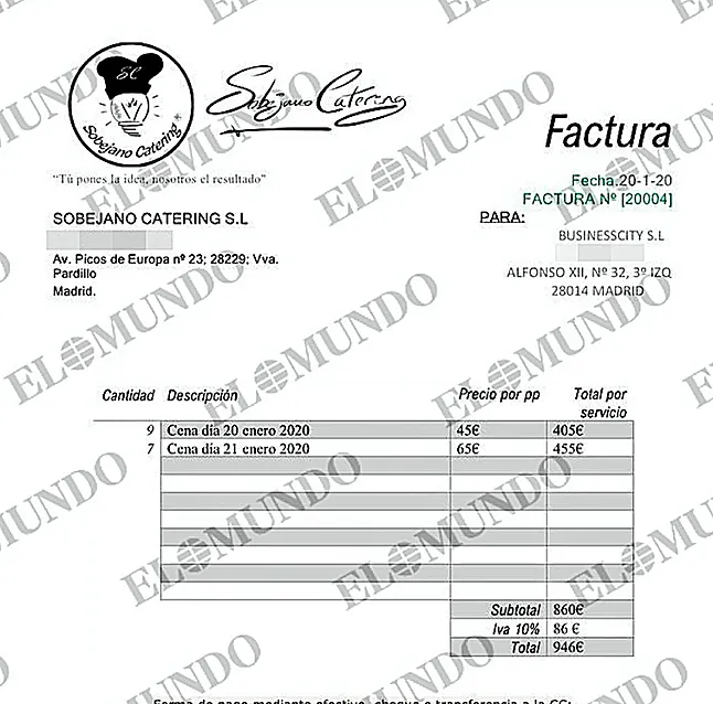 EL MUNDO ha tenido acceso a la factura del catering, emitida por la empresa Sobejano, que dispuso una primera cena para 9 comensales y otra al día siguiente para 7. El cubierto de la primera ascendió a 45 euros y el de la segunda, a 65. De tal forma que esta empresa, a pesar de que finalmente los eventos no se celebraron, pasó a Víctor de Aldama una factura de 946 euros, que fue finalmente abonada.