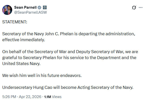 “Agradecemos al secretario Phelan su servicio al Departamento y a la Armada de los Estados Unidos. Le deseamos lo mejor en sus futuros proyectos”, dijo Parnell, y agregó que el subsecretario de la Armada, Hung Cao, ahora se desempeñará como secretario interino de la Armada.