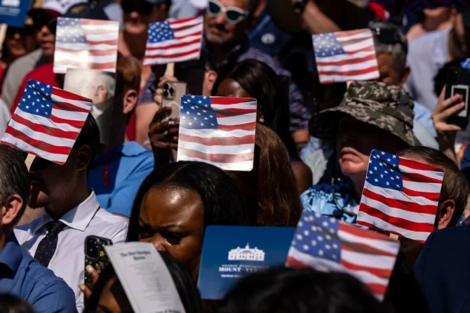 Nuevos ciudadanos durante una ceremonia de naturalización, el 4 de julio de 2025, en los terrenos de la antigua casa de George Washington en Mount Vernon, Virginia. Kent Nishimura/Bloomberg/Getty Images