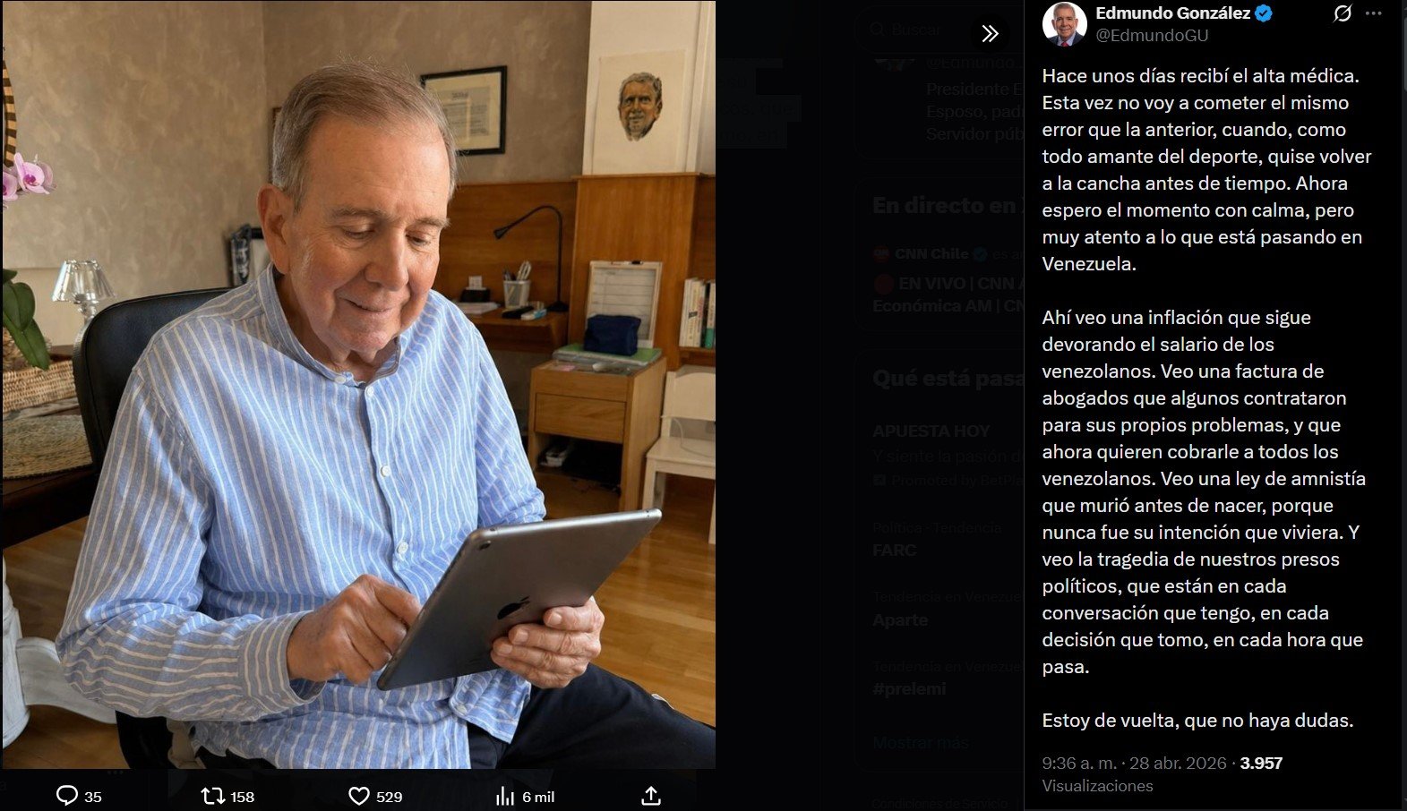 El dirigente opositor afirmó que, aunque sigue recuperándose, permanece atento a la situación que atraviesa Venezuela.
