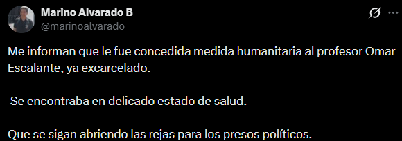 «Me informan que le fue concedida medida humanitaria al profesor Omar Escalante, ya excarcelado. Se encontraba en delicado estado de salud. Que se sigan abriendo las rejas para los presos políticos» confirmó el activista Marino Alvarado en redes sociales.