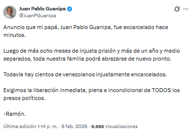 «Anuncio que mi papá, Juan Pablo Guanipa, fue excarcelado hace minutos. Luego de más ocho meses de injusta prisión y más de un año y medio separados, toda nuestra familia podrá abrazarse de nuevo pronto», escribió.