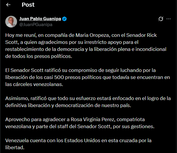 “El senador Scott ratificó su compromiso de seguir luchando por la liberación de los casi 500 presos políticos que todavía se encuentran en las cárceles venezolanas”, escribió Guanipa.