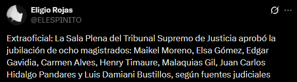 «Extraoficial: La Sala Plena del Tribunal Supremo de Justicia aprobó la jubilación de ocho magistrados: Maikel Moreno, Elsa Gómez, Edgar Gavidia, Carmen Alves, Henry Timaure, Malaquias Gil, Juan Carlos Hidalgo Pandares y Luis Damiani Bustillos, según fuentes judiciales», informó el periodista Eligio Rojas en sus redes sociales, donde adjuntó una fotografía de la reunión.