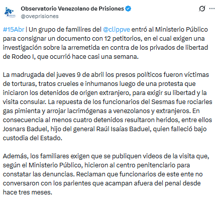 Un grupo de familiares parte del Comité por la Libertad de los Presos Políticos acudió a la sede del Ministerio Público para consignar un documento con 12 petitorios, exigiendo una investigación formal sobre la arremetida violenta ocurrida en El Rodeo I el pasado 9 de abril.