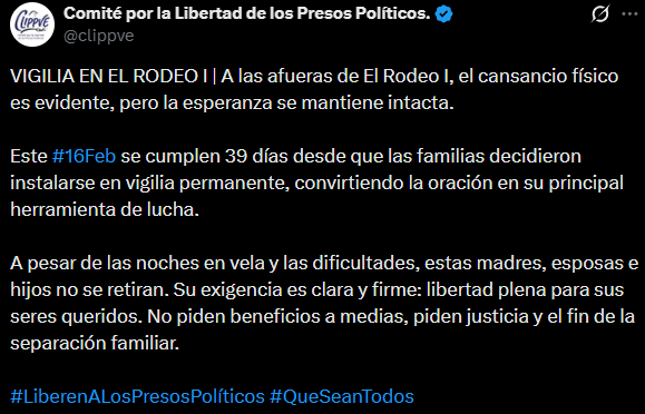 «Este 16 de febrero se cumplen 39 días desde que las familias decidieron instalarse en vigilia permanente, convirtiendo la oración en su principal herramienta de lucha», recordó el ClippVe.
