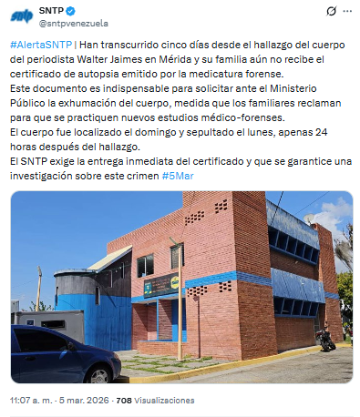 A cinco días del hallazgo del cuerpo del periodista Walter Jaimes en el estado Mérida, sus familiares denunciaron que la medicatura forense aún no ha hecho entrega del certificado de autopsia.