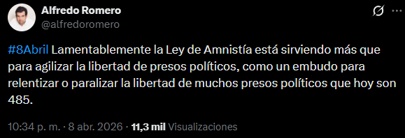 «Lamentablemente la Ley de Amnistía está sirviendo más que para agilizar la libertad de presos políticos, como un embudo para ralentizar o paralizar la libertad de muchos presos políticos que hoy son 485», dijo el director presidente de la ONG, Alfredo Romero, en un mensaje en X, sin añadir más detalles.