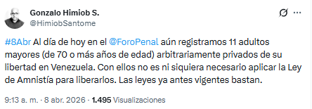 El director vicepresidente de la ONG Foro Penal, Gonzalo Himiob, denunció este 8 de abril que al menos 11 adultos mayores, de 70 años o más, permanecen privados de su libertad de manera arbitraria en Venezuela.