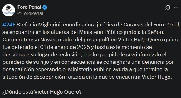 A través de un video difundido en su cuenta en X, Stefania Migliorini, coordinadora jurídica de Caracas de la ONG, acudió a la sede del Ministerio Público junto a Carmen Teresa Navas, madre de Quero, para consignar formalmente una denuncia y exigir información sobre su ubicación.