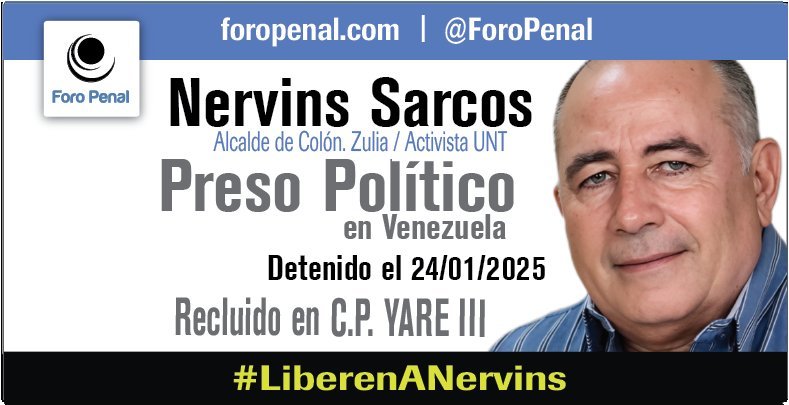 La ONG Foro Penal recordó la noche del jueves 5 de febrero, el caso de la detención arbitraria del alcalde electo del municipio Colón, estado Zulia, Nervins de Jesús Sarcos Urdaneta, de 64 años de edad, dirigente del partido Un Nuevo Tiempo (UNT), quien permanece recluido en el Centro Penitenciario Yare III, en el estado Miranda.