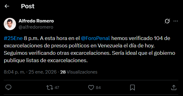 La organización no gubernamental Foro Penal informó este domingo 25 de enero, que ha verificado 104 excarcelaciones de presos políticos en Venezuela durante el día, aunque el conteo total, aún continúa en proceso de confirmación.