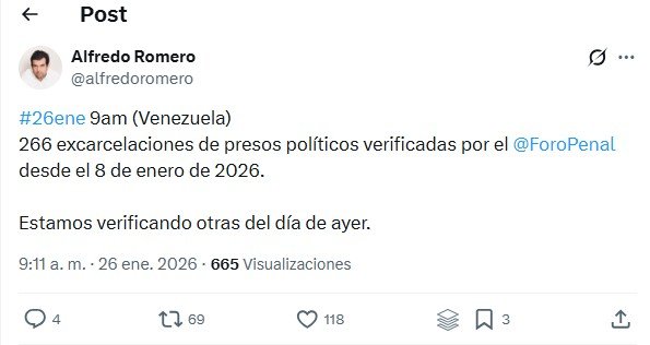 «9am (Venezuela) 266 excarcelaciones de presos políticos verificadas por el Foro Penal desde el 8 de enero de 2026″, publicó en la red social X el director presidente de Foro Penal, Alfredo Romero, al precisar que la cifra se actualizó.