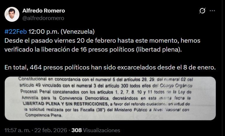 Romero detalló que, además de estas 16 excarcelaciones recientes, un total de 464 presos políticos han sido liberados desde el 8 de enero de este año, de acuerdo con las verificaciones efectuadas por la organización.