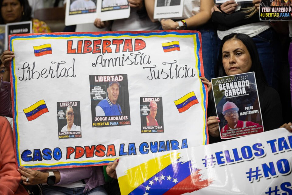 Fotografía que muestra carteles de personas detenidas en una rueda de prensa este miércoles, en Caracas (Venezuela). Un grupo de familiares pidió que 170 trabajadores de la estatal petrolera Pdvsa, detenidos entre 2024 y 2025, sean incluidos en el proyecto de ley de amnistía que discute el Parlamento -controlado por el chavismo- porque consideran que se trata de un caso político por violaciones al debido proceso, entre ellas, haber sido capturados sin una orden judicial. EFE/ Ronald Peña R