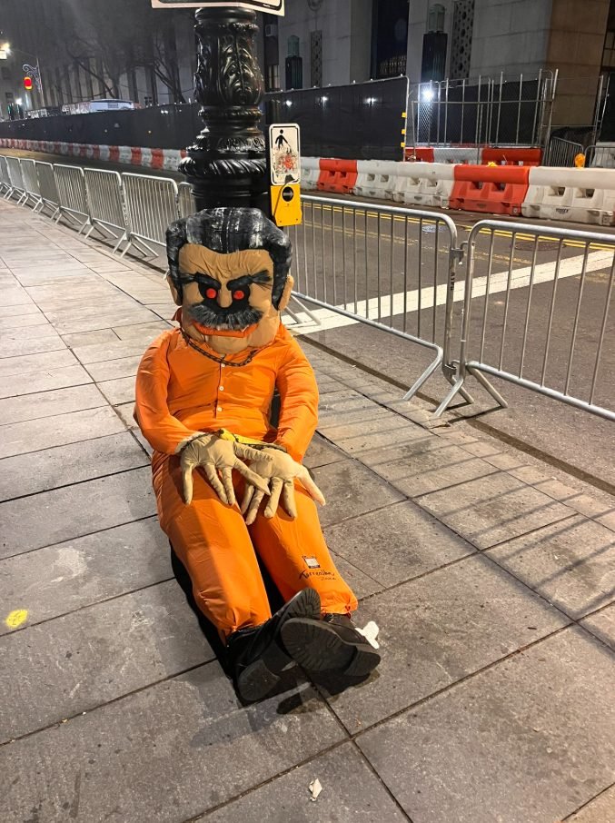 Un singular muñeco espera a Nicolás Maduro y a su esposa, Cilia Flores, en la acera frente a la corte del Distrito Sur de Nueva York, Estados Unidos, donde procesan al expresidente chavista por presuntos delitos de narcotráfico y lavado de dinero.
