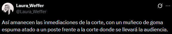 «Así amanecen las inmediaciones de la corte, con un muñeco de goma espuma atado a un poste frente a la corte donde se llevará la audiencia». comentó en redes sociales la periodista Laura Weffer, quien tomó una fotografía de la figura.