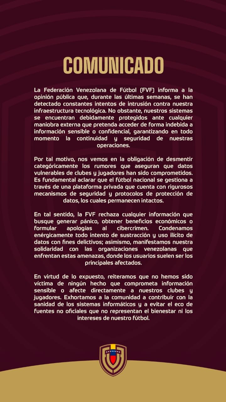 Según el documento publicado por el máximo ente del fútbol en Venezuela, durante las últimas semanas se han detectado «constantes intentos de intrusión» contra sus sistemas. Sin embargo, la FVF fue enfática al asegurar que sus protocolos de seguridad han funcionado correctamente.