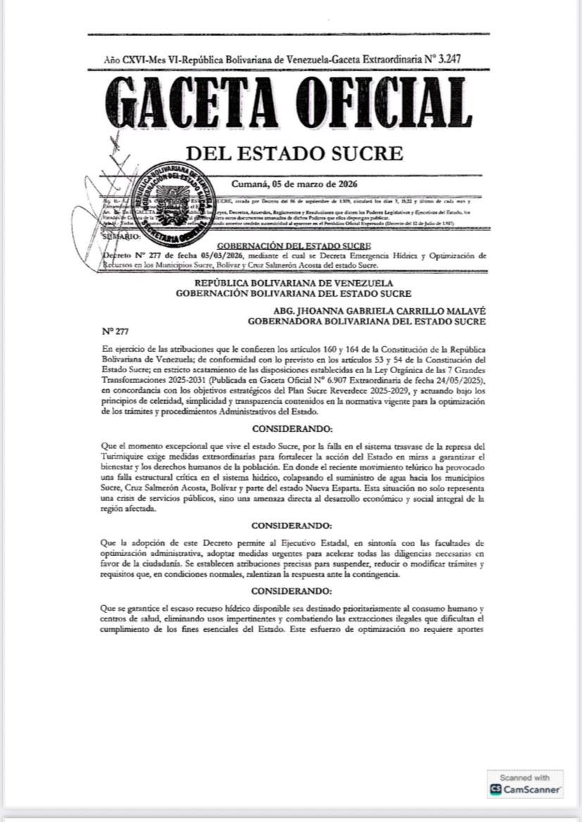 Ante la crítica situación del sistema de trasvase de la represa del Turimiquire y la falta de agua que padecen los habitantes de Cumaná, Araya y Marigüitar, la Gobernación del estado Sucre oficializó la declaratoria de emergencia hídrica a través del Decreto N° 277.