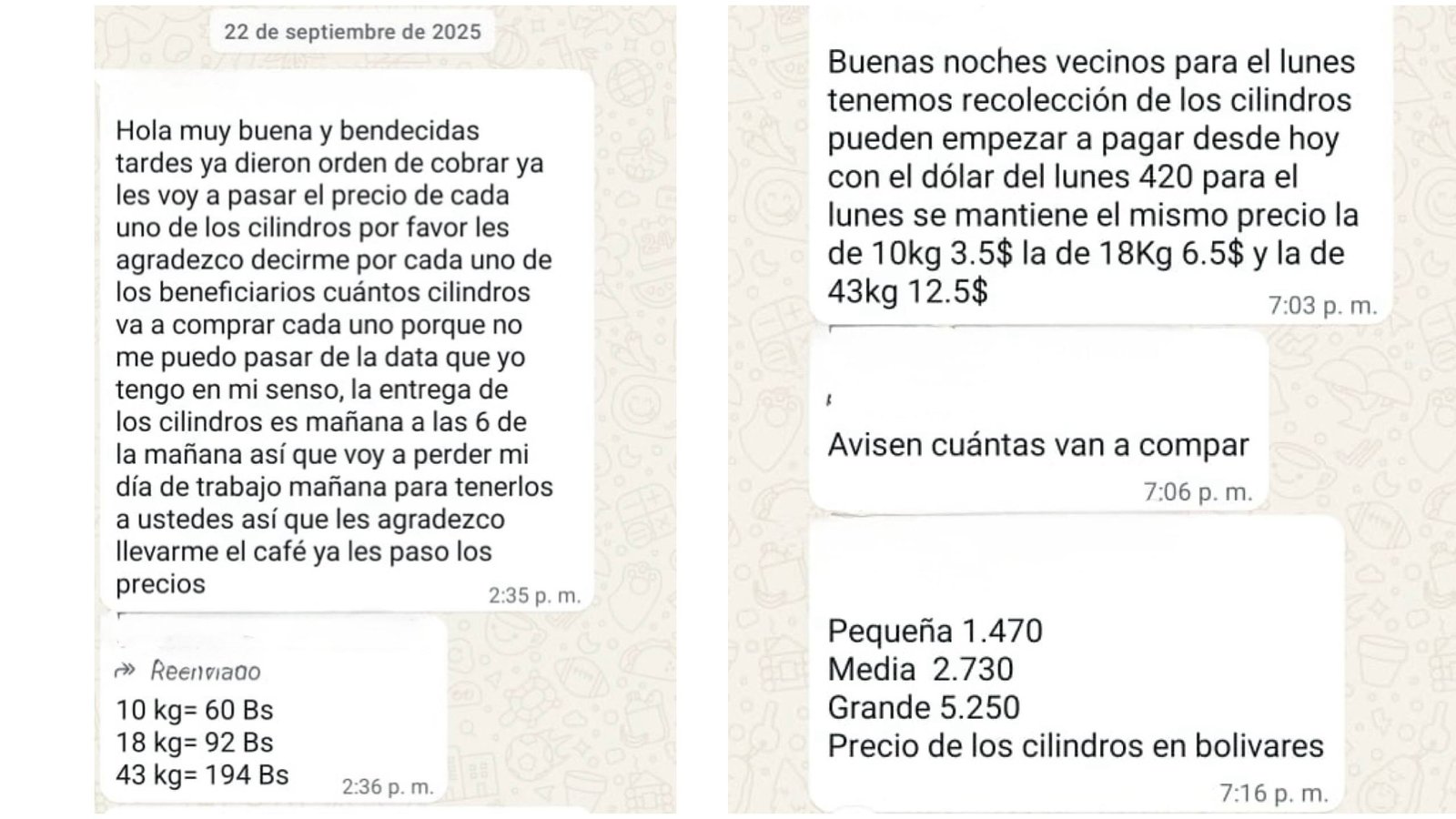 Ese día la tasa oficial estaba en 420 bolívares por dólar, es decir el costo en divisas era: 3.5$ por la bombona pequeña, 6.5$ por la mediana y 12.5$ por la presentación más grande.