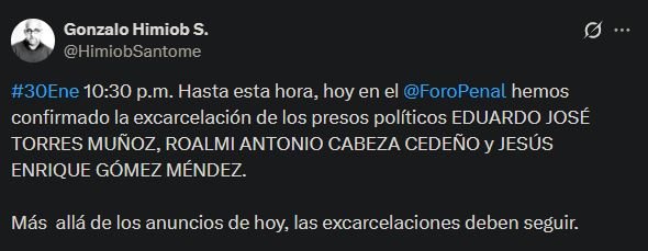 “10:30 p.m. Hasta esta hora, hoy en el Foro Penal hemos confirmado la excarcelación de los presos políticos EDUARDO JOSÉ TORRES MUÑOZ, ROALMI ANTONIO CABEZA CEDEÑO y JESÚS ENRIQUE GÓMEZ MÉNDEZ. Más allá de los anuncios de hoy, las excarcelaciones deben seguir”, escribió.