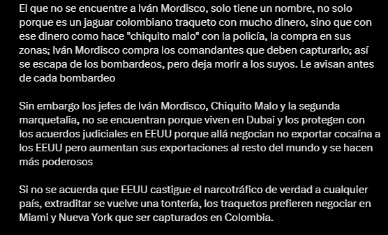 «Sin embargo, los jefes de Iván Mordisco, Chiquito Malo y la Segunda Marquetalia (otra disidencia de las Farc) no se encuentran (en Colombia) porque viven en Dubái y los protegen con los acuerdos judiciales en EEUU porque allá negocian no exportar cocaína a los EEUU pero aumentan sus exportaciones al resto del mundo y se hacen más poderosos», afirmó Petro.