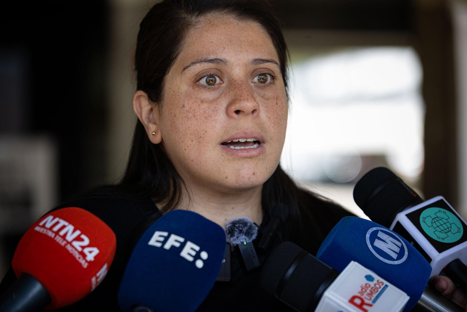 Andreína Baduel, hermana del detenido Josnars Baduel, habla durante una rueda de prensa en una jornada de recolección de insumos este sábado, en Caracas (Venezuela). La ONG venezolana Comité por la Libertad de los Presos Políticos (Clipp) organizó una recolecta de insumos, entre alimentos, artículos de higiene y medicinas, para ayudar a los familiares de estos detenidos que hacen vigilias a las afueras de las cárceles desde hace 73 días. EFE/ Ronald Peña R