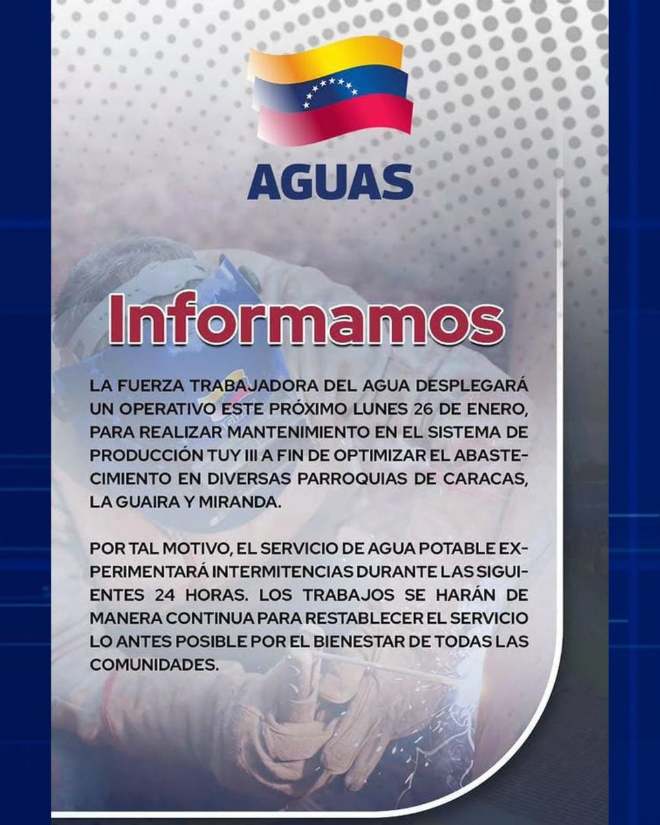 Hidrocapital informó que este lunes 26 de enero se realizará una suspensión temporal del servicio de agua potable por un lapso de 24 horas, debido a trabajos de mantenimiento preventivo en el Sistema de Producción Tuy III.