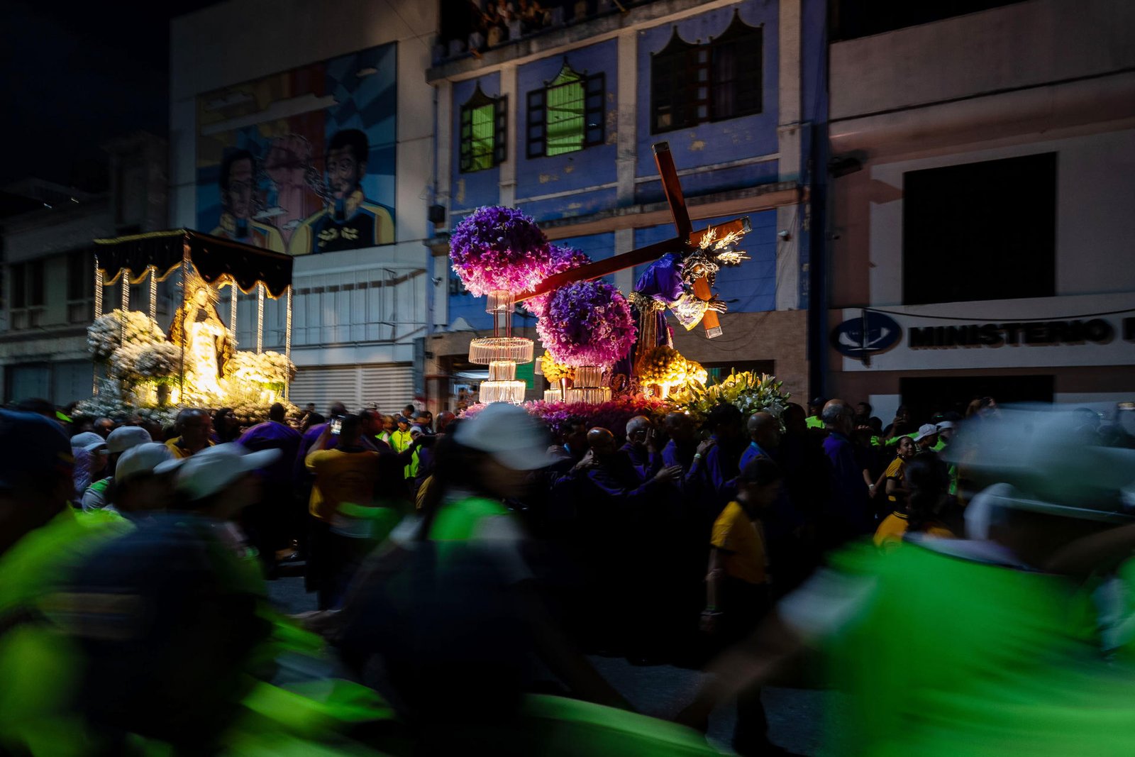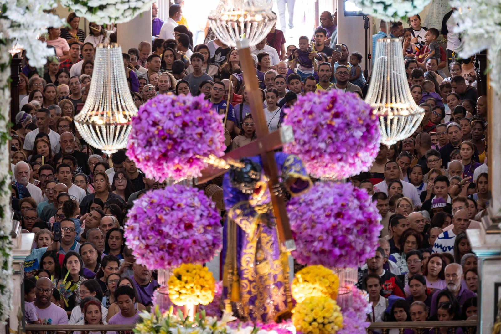 La figura del Nazareno estaba rodeada de 6.000 orquídeas moradas, la flor nacional de Venezuela, y de 600 flores amarillas, que fueron donadas por sus devotos hasta el pasado lunes.