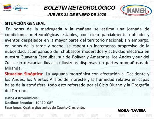 El Instituto Nacional de Meteorología e Hidrología (Inameh) informó que para este jueves 22 de enero prevalecerán condiciones meteorológicas estables durante las primeras horas del día, con un incremento de la inestabilidad hacia la tarde y noche en diversas zonas del país.