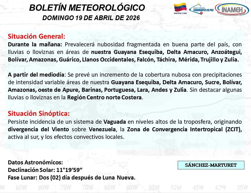 De acuerdo con el reporte, se registran precipitaciones en áreas de la Guayana Esequiba, Delta Amacuro, norte de Anzoátegui, Bolívar, Amazonas, sur de Guárico, Llanos Occidentales, oeste de Falcón, así como en los estados Táchira, Mérida, Trujillo y Zulia.
