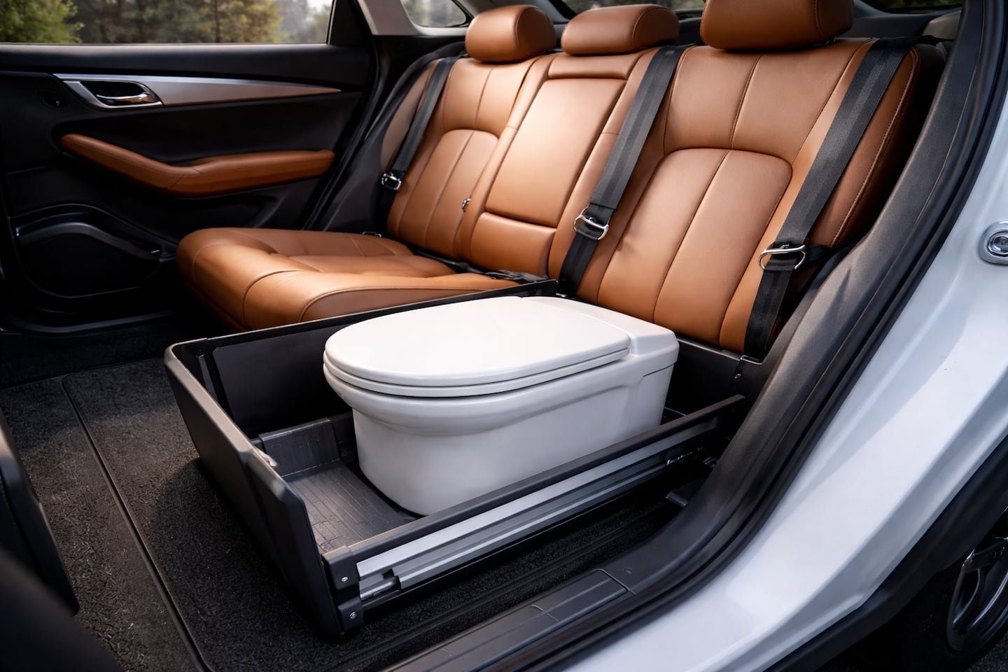 El mecanismo funciona de manera similar a un cajón: el inodoro puede extraerse cuando se necesita y volver a guardarse tras su uso. Para ello, incorpora una estructura que se conecta directamente con el asiento del vehículo, facilitando su integración dentro del habitáculo.