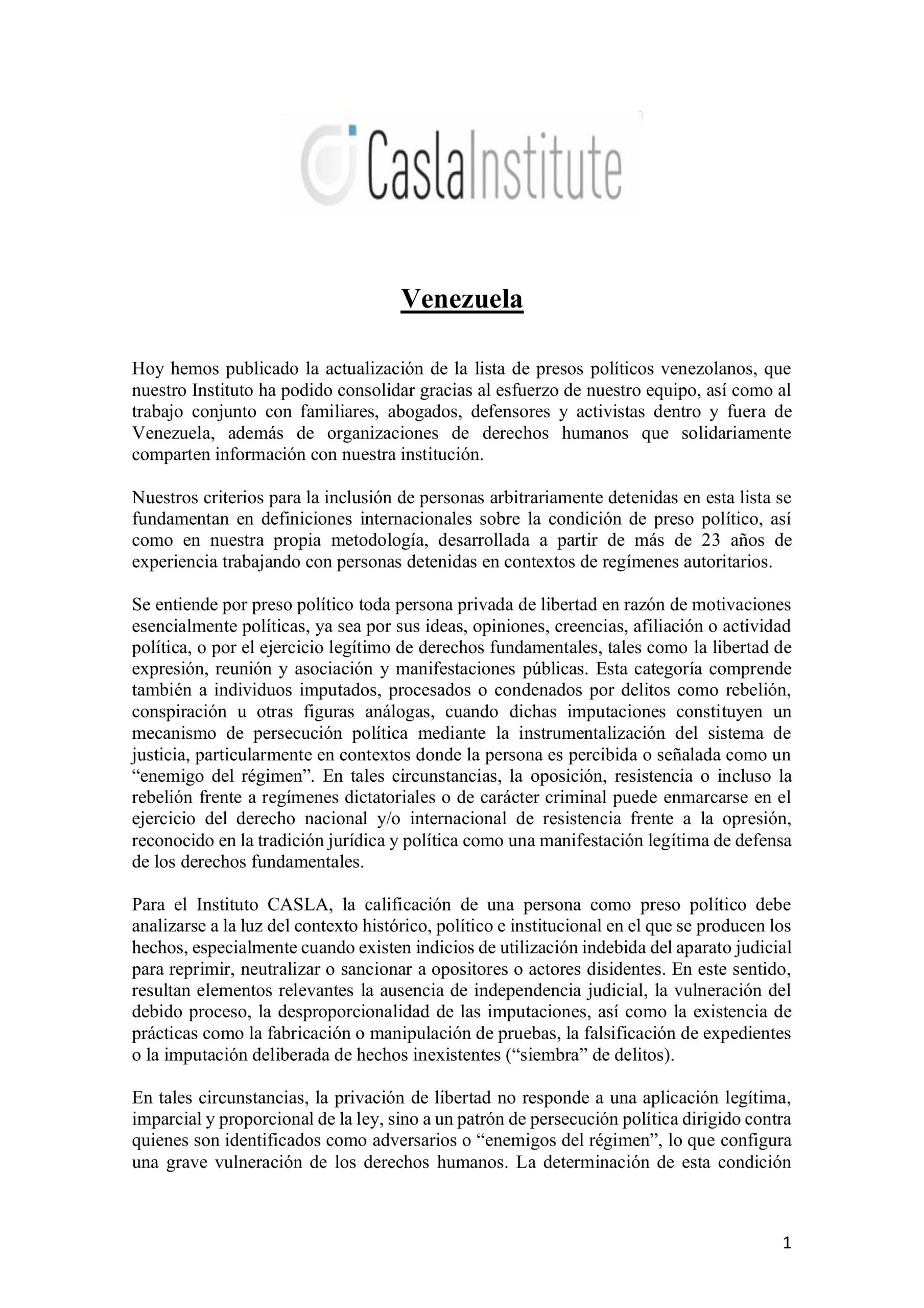 El Centro de Acción Social por la Libertad y la Autonomía especializado en América Latina (Casla) emitió un comunicado donde denuncia las inconsistencias en la aplicación de la Ley de Amnistía para los presos políticos en Venezuela.