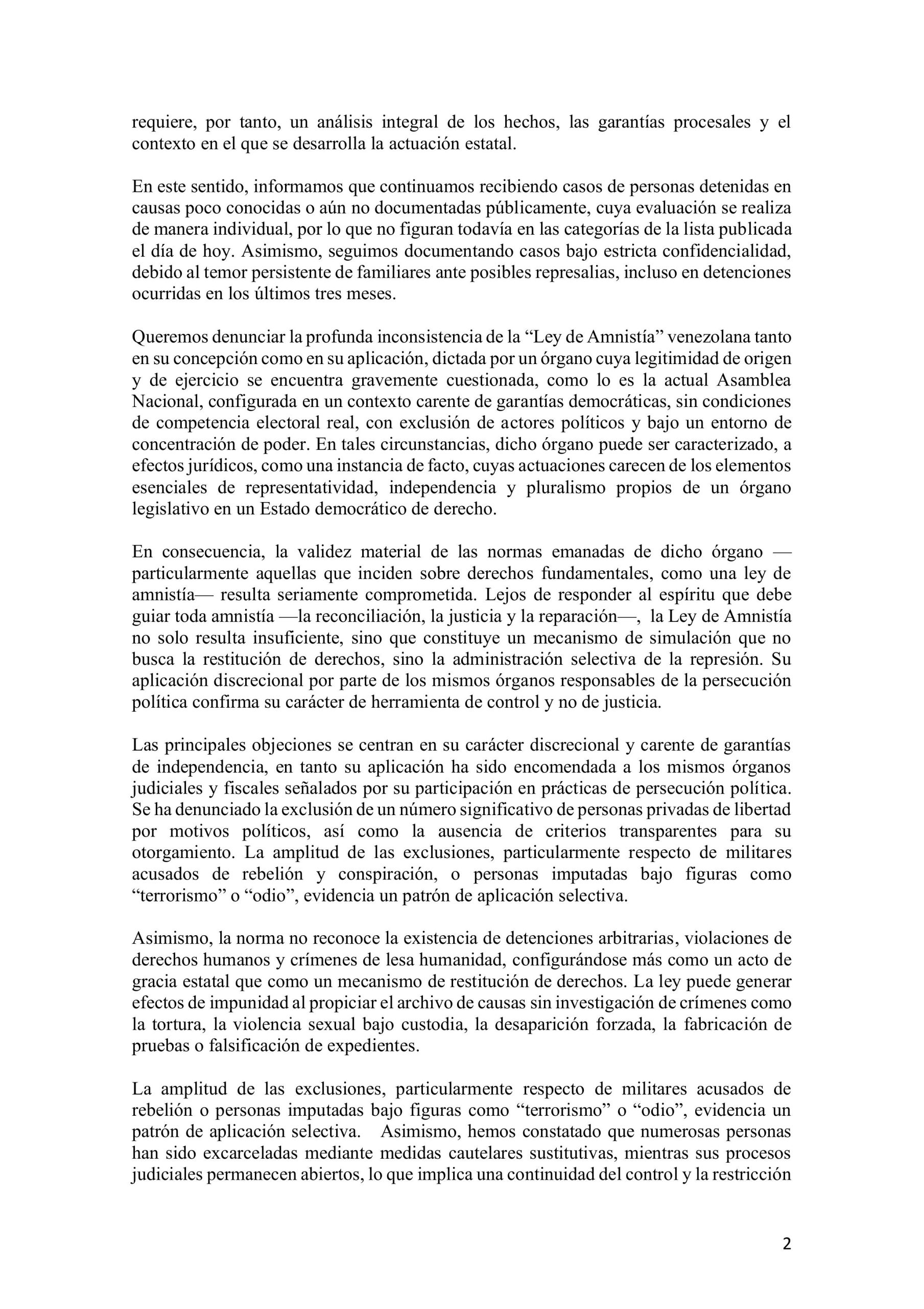 “Queremos denunciar la profunda inconsistencia de la Ley de Amnistía venezolana tanto en su concepción como en su aplicación, dictada por un órgano cuya legitimidad de origen y de ejercicio se encuentra gravemente cuestionada, como lo es la actual Asamblea Nacional”, publicó el Instituto a través de un comunicado.