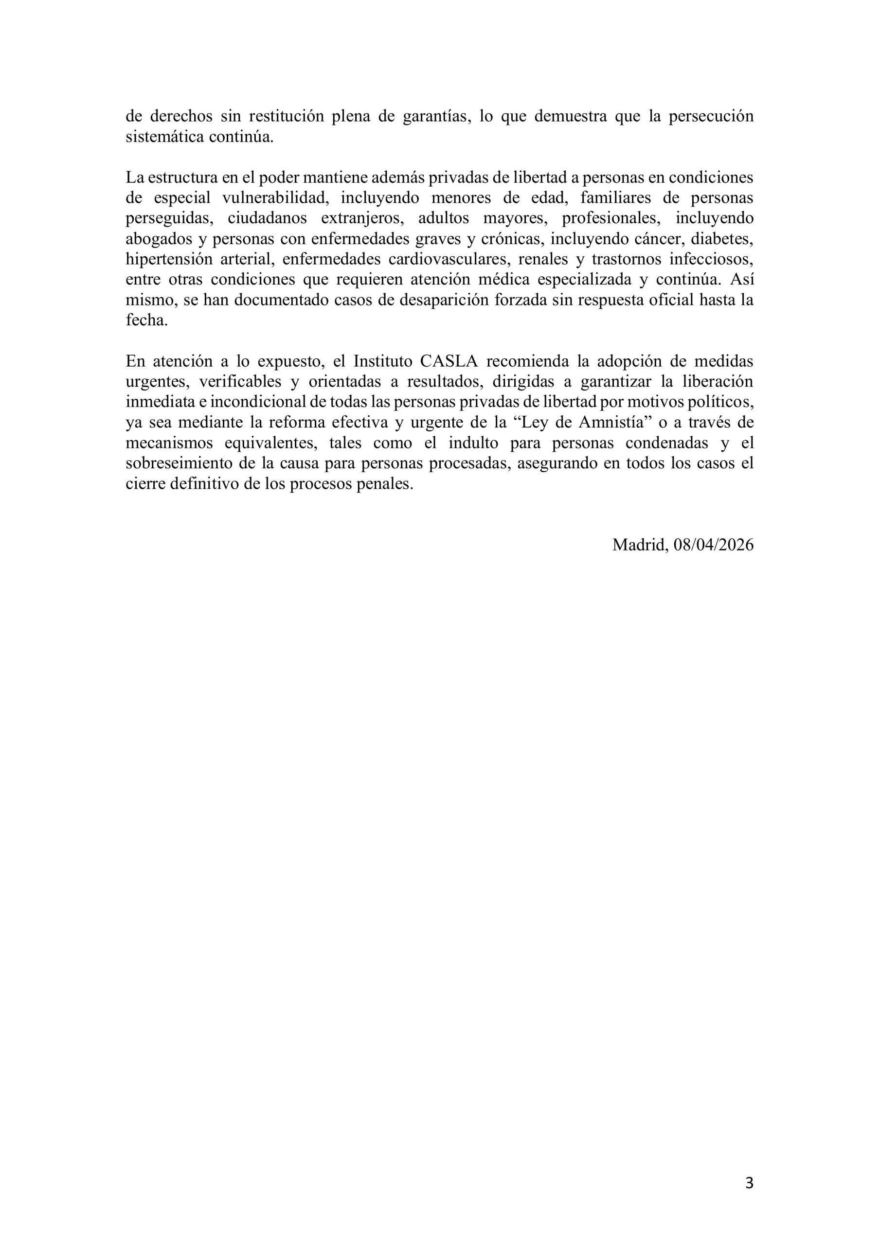 Casla puntualizó que la privación de libertad no responde a una aplicación legítima, imparcial y proporcional de la ley, sino a un patrón de persecución política dirigido contra quienes son identificados como adversarios o “enemigos del régimen”, lo que configura una grave vulneración de los derechos humanos.