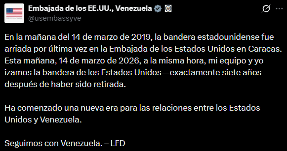«Esta mañana, 14 de marzo de 2026, a la misma hora, mi equipo y yo izamos la bandera de los Estados Unidos—exactamente siete años después de haber sido retirada», confirmó la diplomática, quien incluyó una fotografía en sus redes sociales.