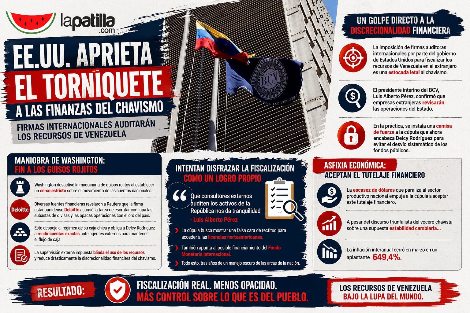 En consecuencia, el aparato de propaganda intentó disfrazar esta fiscalización extranjera como un logro propio de transparencia. “Que consultores externos auditen los activos de la República nos da tranquilidad”, justificó Pérez, en una declaración que evidenció la urgencia de la cúpula por mostrar una falsa cara de rectitud para acceder a las licencias norteamericanas y al posible financiamiento del Fondo Monetario Internacional, luego de años de un manejo oscuro de las arcas de la nación.