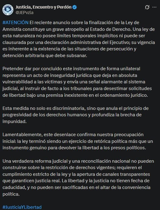 La ONG Justicia, Encuentro y Perdón (JEP) alertó este jueves que la finalización de la Ley de Amnistía en Venezuela deja en una situación de vulnerabilidad a los presos políticos, al considerar que la medida representa un retroceso en materia de derechos humanos.