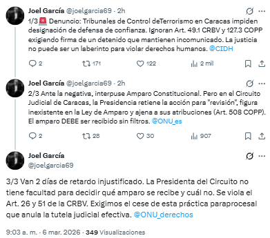 El abogado penalista Joel García denunció a través de su cuenta en X que los Tribunales de Control de Terrorismo en Caracas están impidiendo sistemáticamente la designación de defensores de confianza.