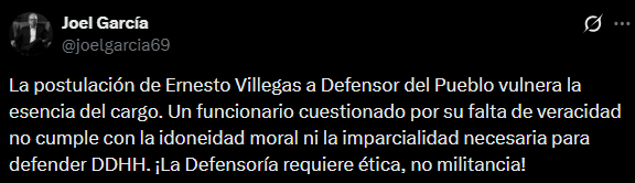 «La postulación de Ernesto Villegas a Defensor del Pueblo vulnera la esencia del cargo», enfatizó García en sus redes sociales.
