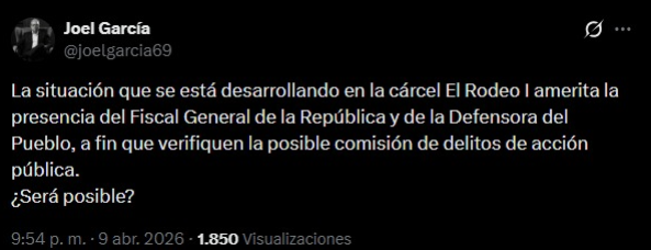 “La situación que se está desarrollando en la cárcel El Rodeo I amerita la presencia del Fiscal General de la República y de la Defensora del Pueblo, a fin que verifiquen la posible comisión de delitos de acción pública. ¿Será posible?”, publicó el jurista a través de su cuenta en X, en referencia a las recientes designaciones de Larry Devoe y Eglee González como Fiscal General y Defensora del Pueblo, respectivamente.