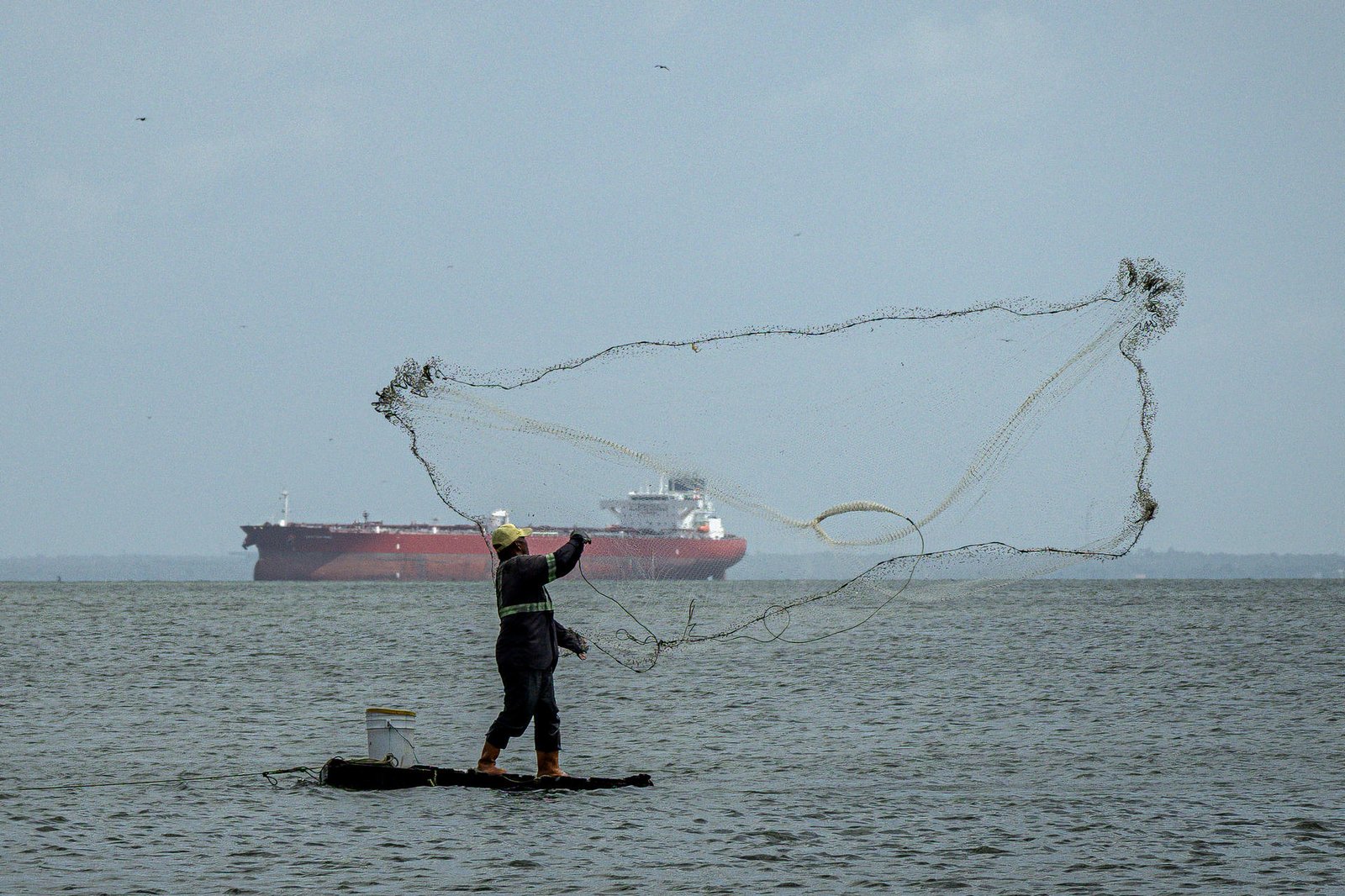 Un hombre lanza una red de pesca en el Lago de Maracaibo este miércoles, en Maracaibo (Venezuela). EFE/ Henry Chirinos