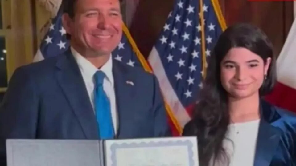 La invitación a la casa del gobernador DeSantis se realizó como parte de un acto de entrega formal de premios a estudiantes destacados. En las imágenes difundidas, se observa a la joven recibiendo el certificado que avala su beca, rodeada de banderas oficiales y en un ambiente de celebración por sus logros académicos.