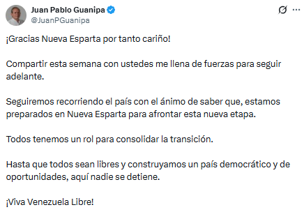 Juan Pablo Guanipa concluyó una gira por el estado Nueva Esparta, desde donde envió un mensaje de agradecimiento y optimismo.