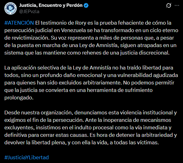 La ONG venezolana Justicia, Encuentro y Perdón (JEP) aseguró este lunes que la aplicación selectiva de la Ley de Amnistía, promulgada en febrero pasado, provoca una vulnerabilidad agudizada, luego de que al periodista Rory Branker le negaran esta medida.