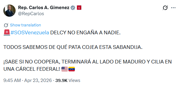 El congresista de Estados Unidos, Carlos Giménez, cuestionó este jueves 23 de abril la gestión de Delcy Rodríguez y aseguró que el incumplimiento de las normativas internacionales podría derivar en consecuencias penales similares a las que enfrenta Nicolás Maduro ante la justicia federal.